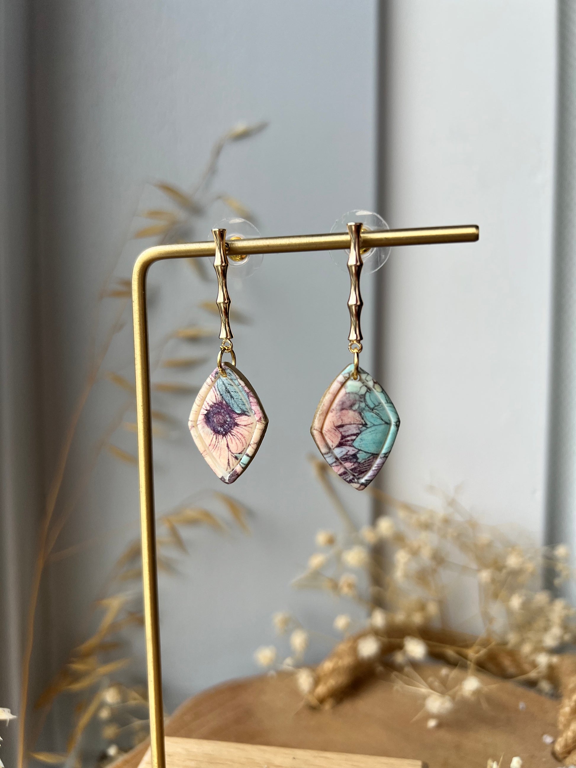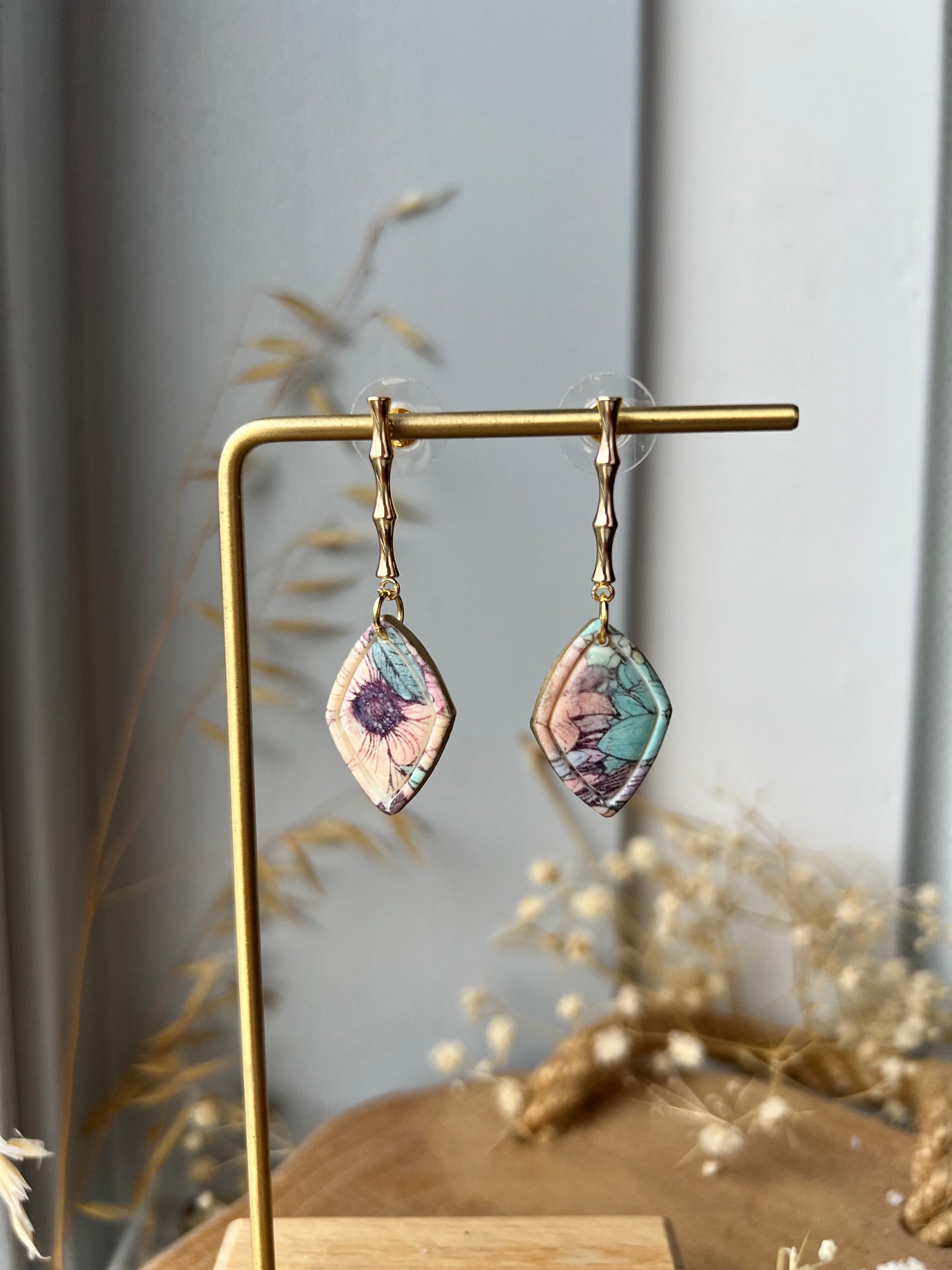 Een 18k gold plated stekertje voor in je oor die van chirurgisch stainless steel is gemaakt. Daaronder een klein bedeltje in meerkleurige bloemen.