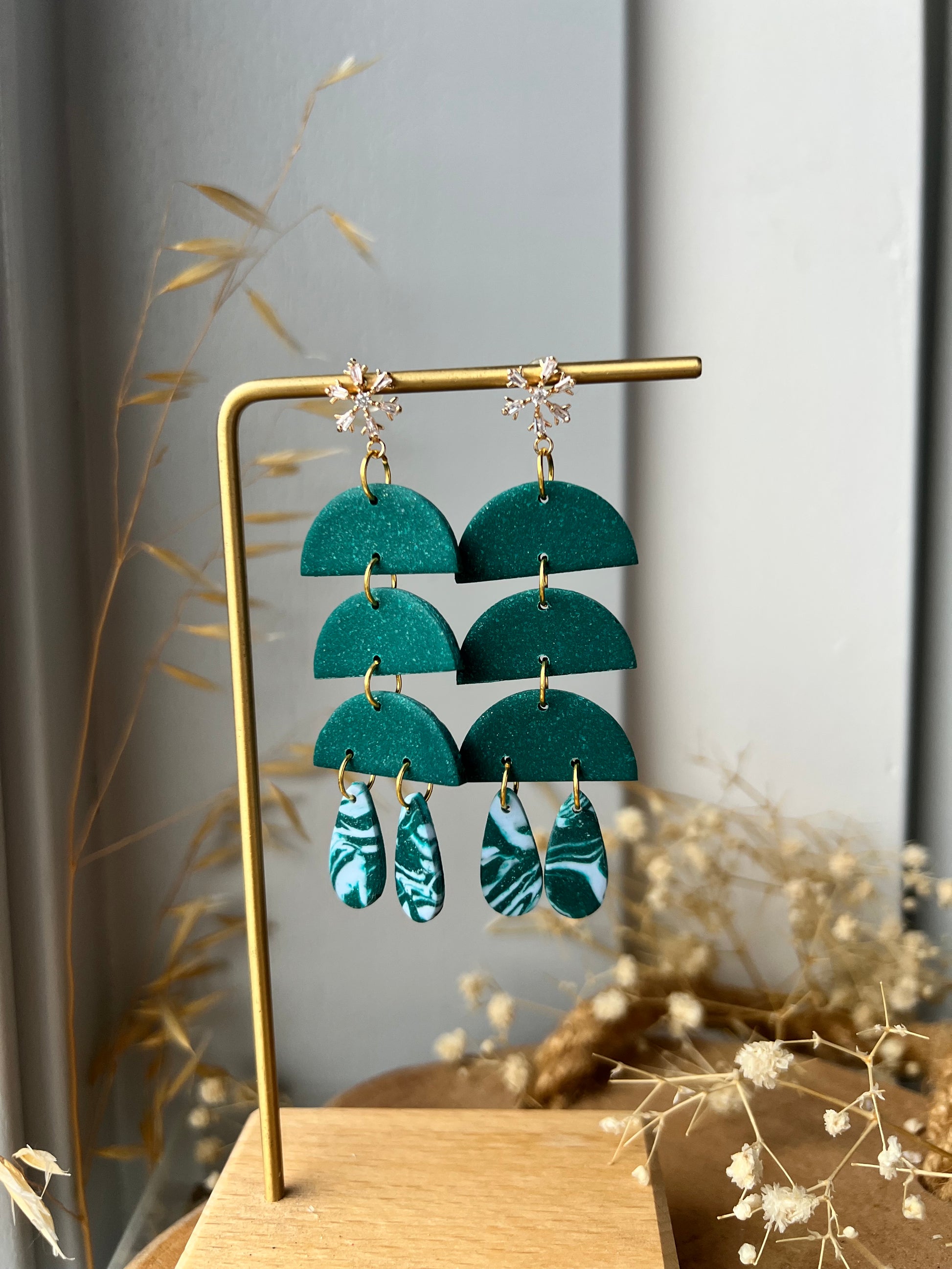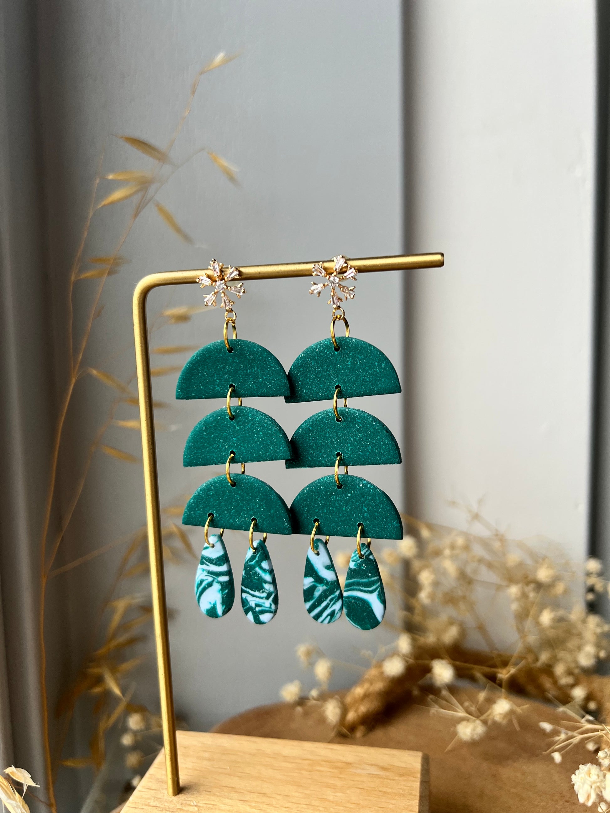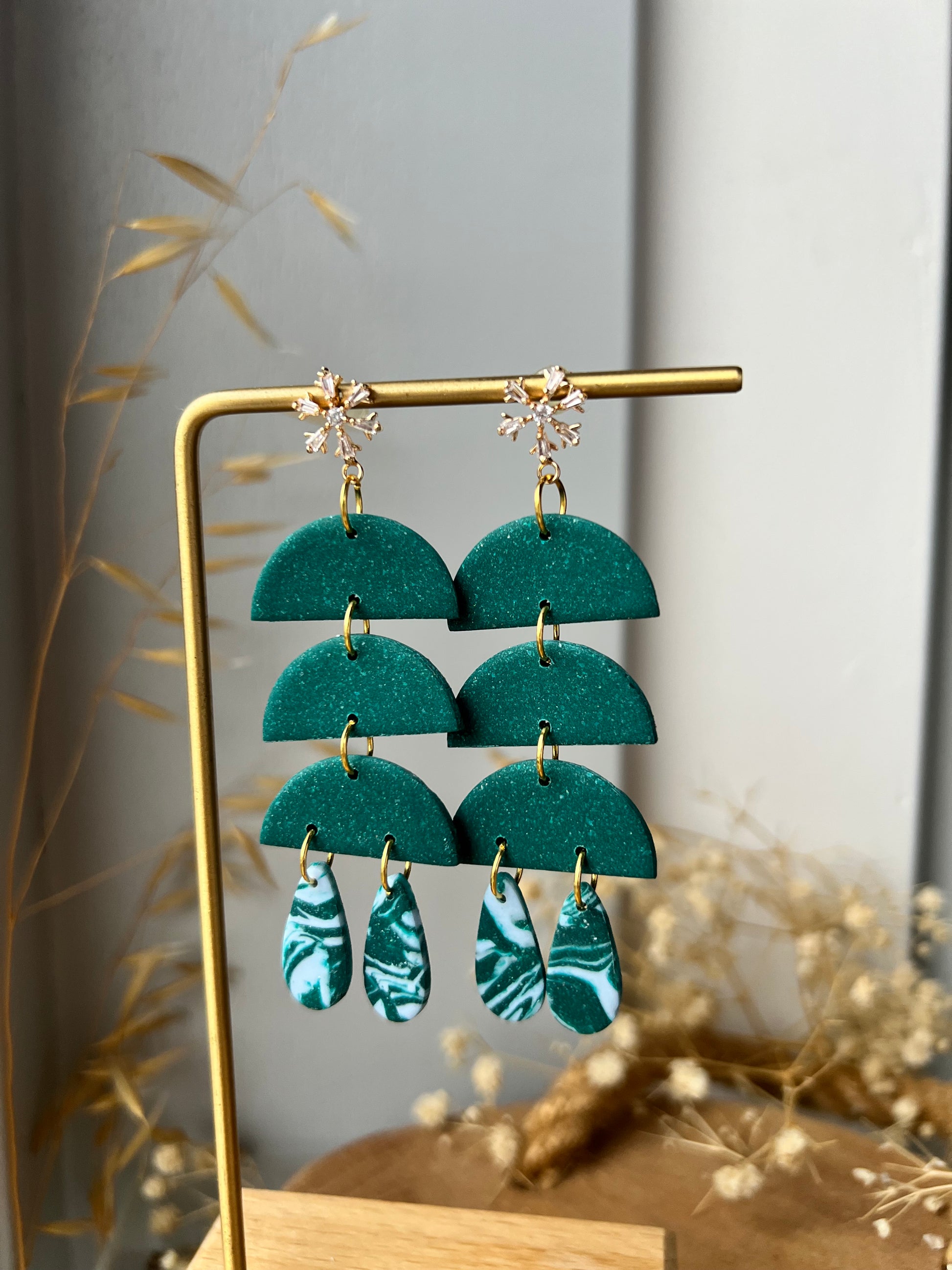 Galaxy groene statement oorbellen. De oorbellen zijn in de kleur galaxy groen. Ze hebben een kleine sparkle. Ze zijn afgewerkt met 18k gold plated knopjes in de vorm van een sneeuwvlokje.