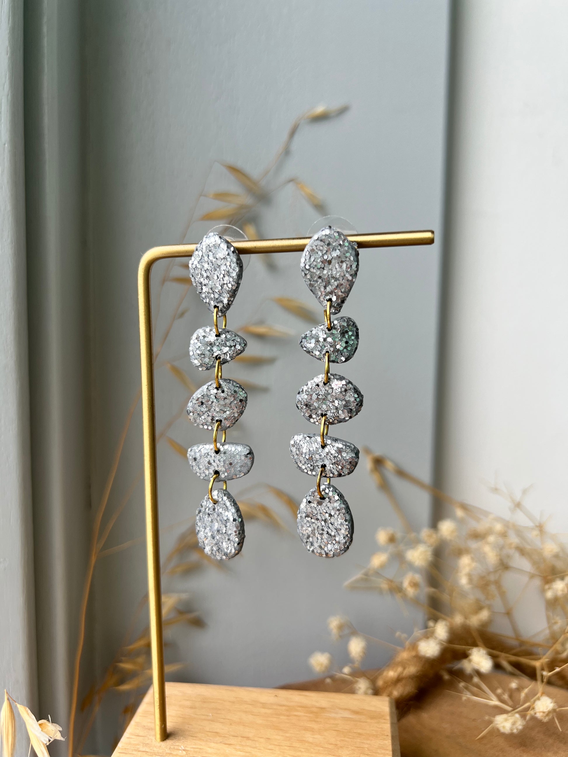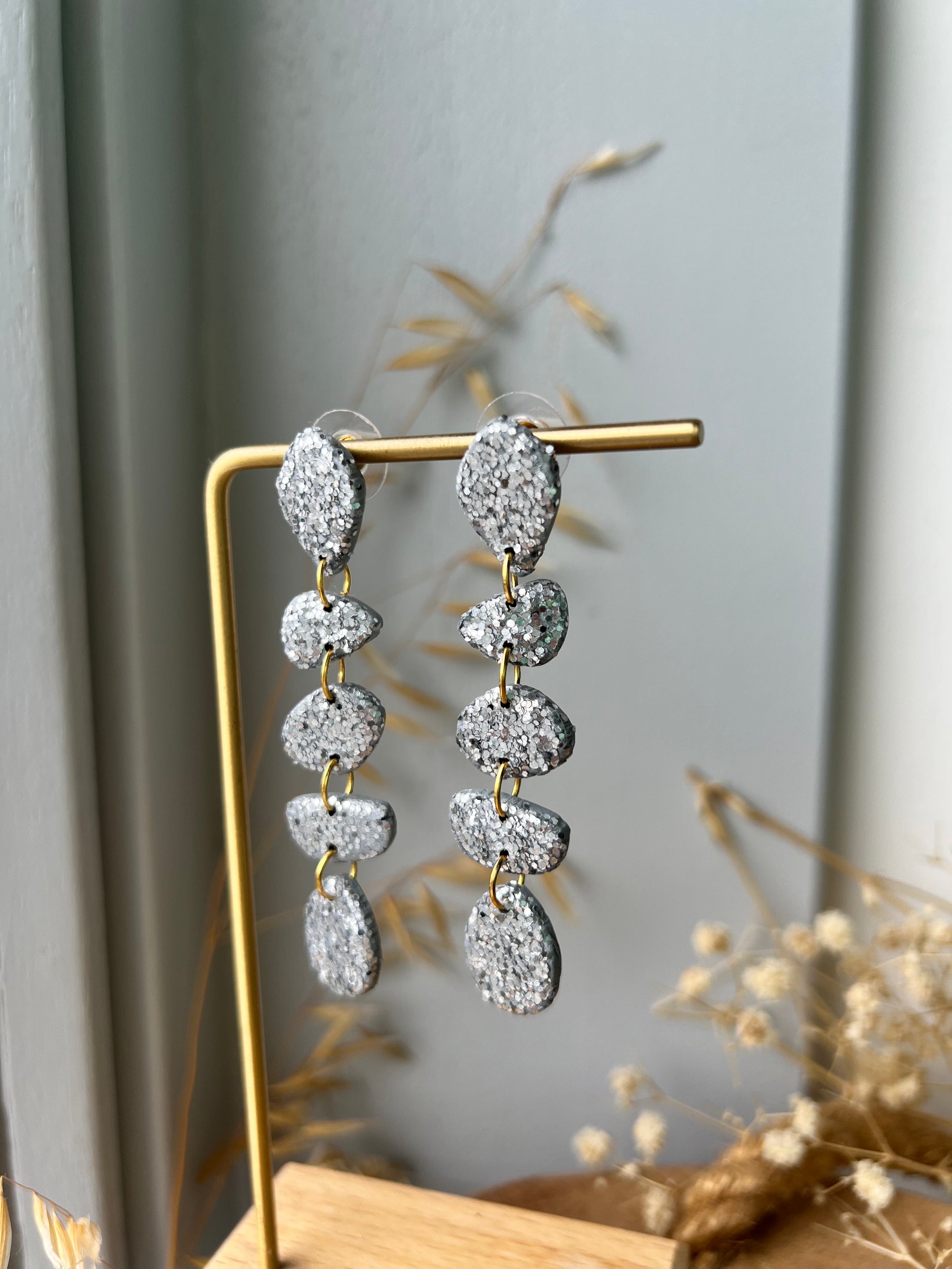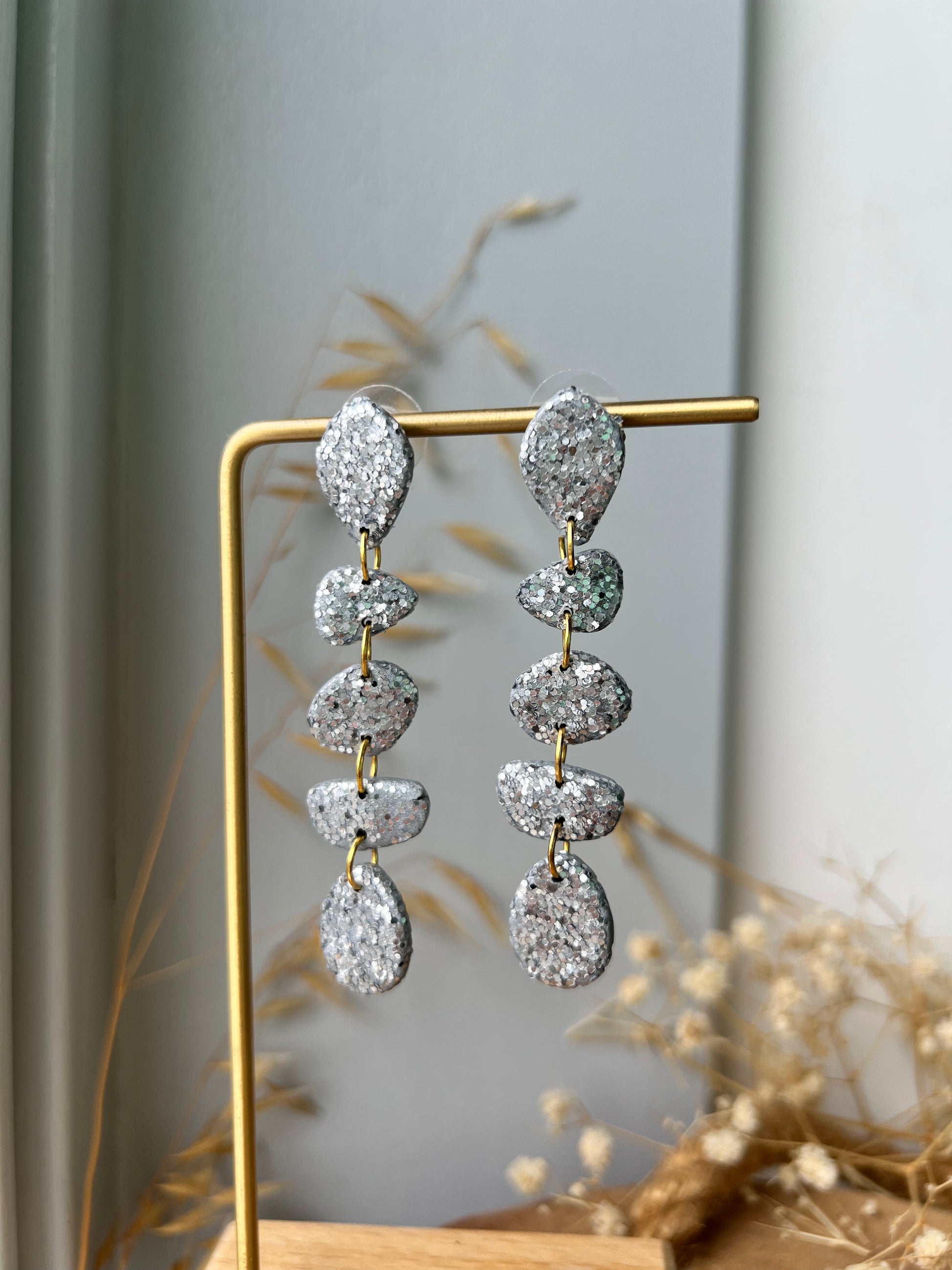 De oorbellen zijn in het zilver, afgewerkt met zilveren glitters in het geheel. De ringetjes zijn 18k goud verguld.