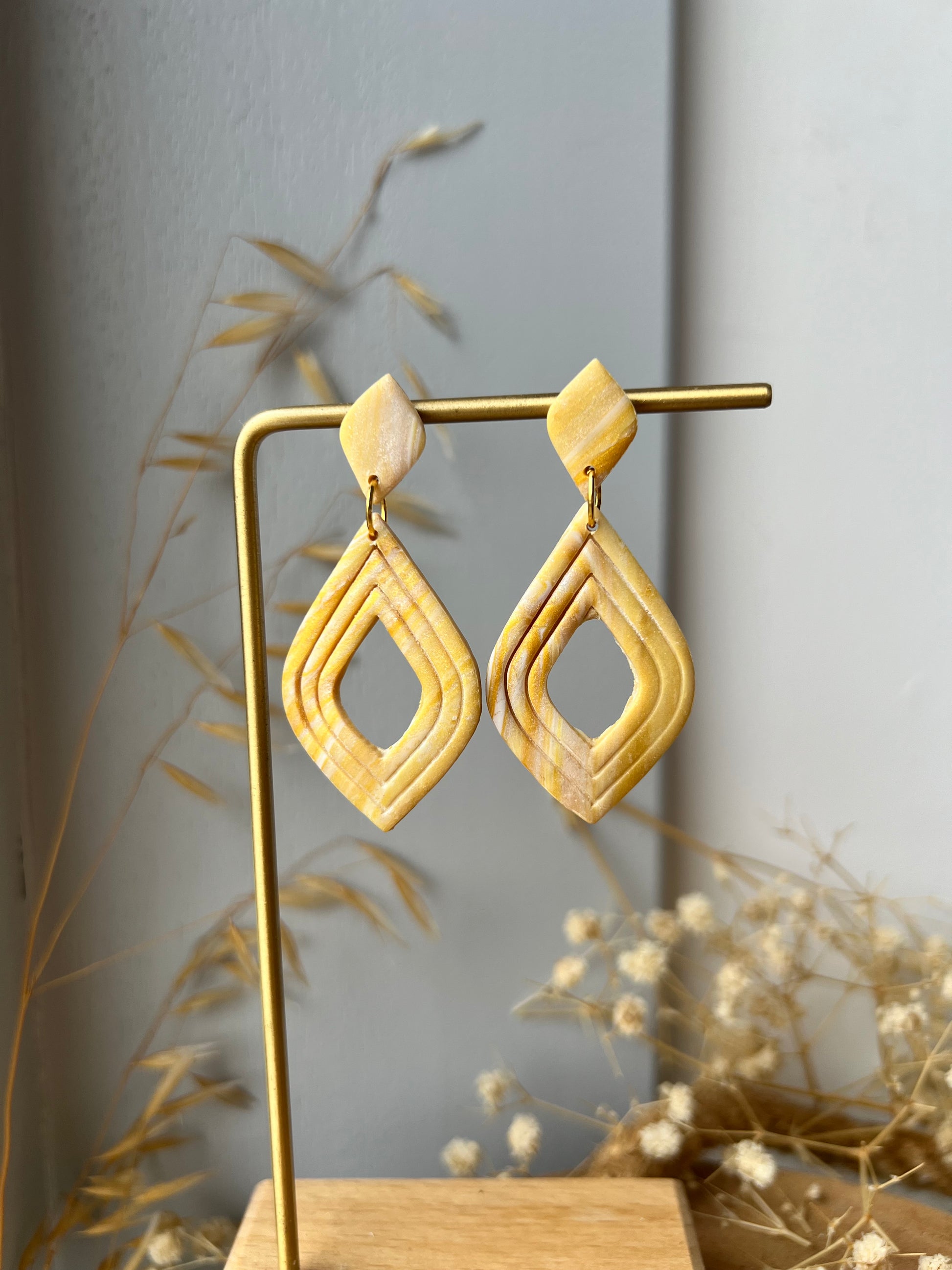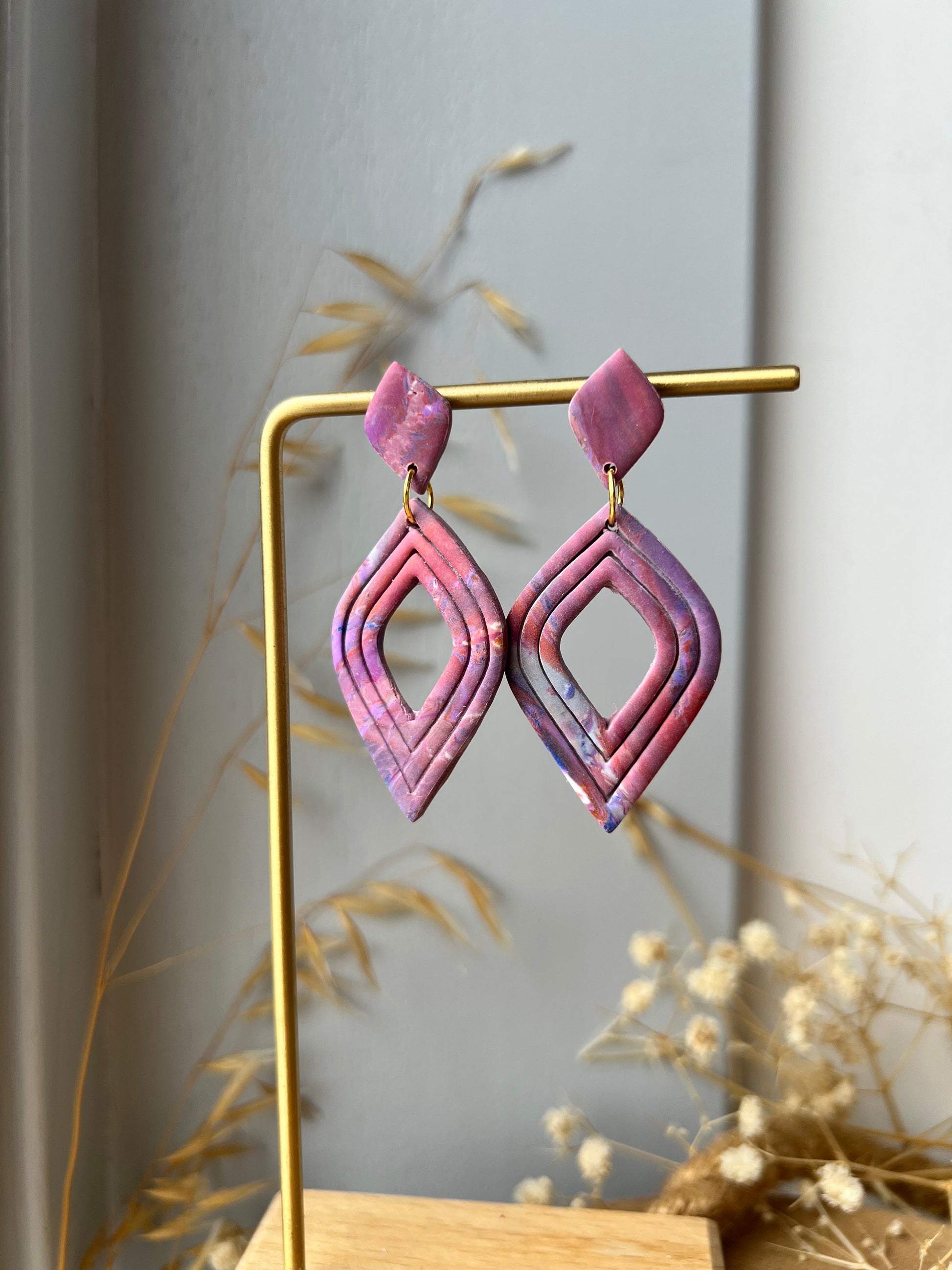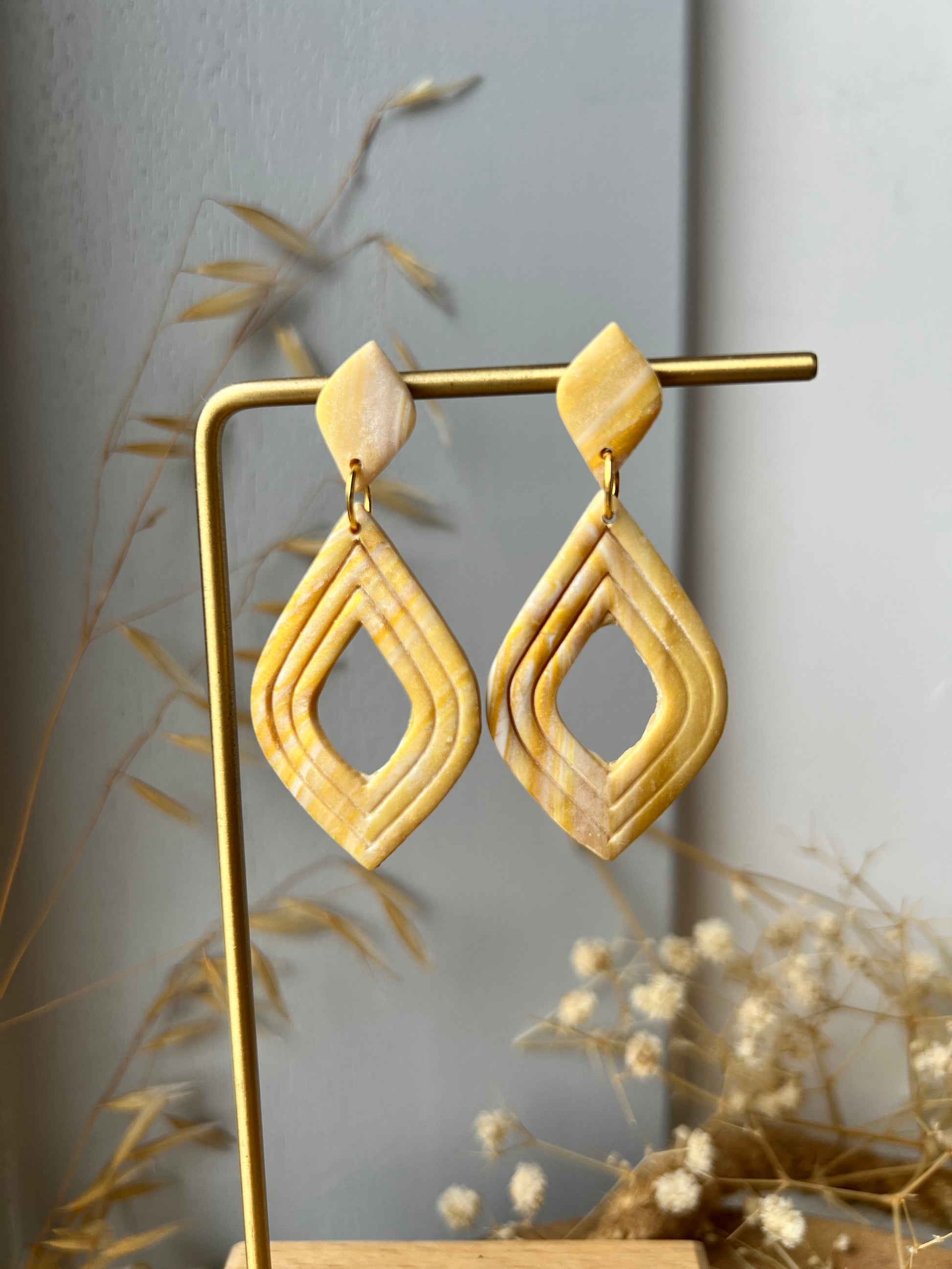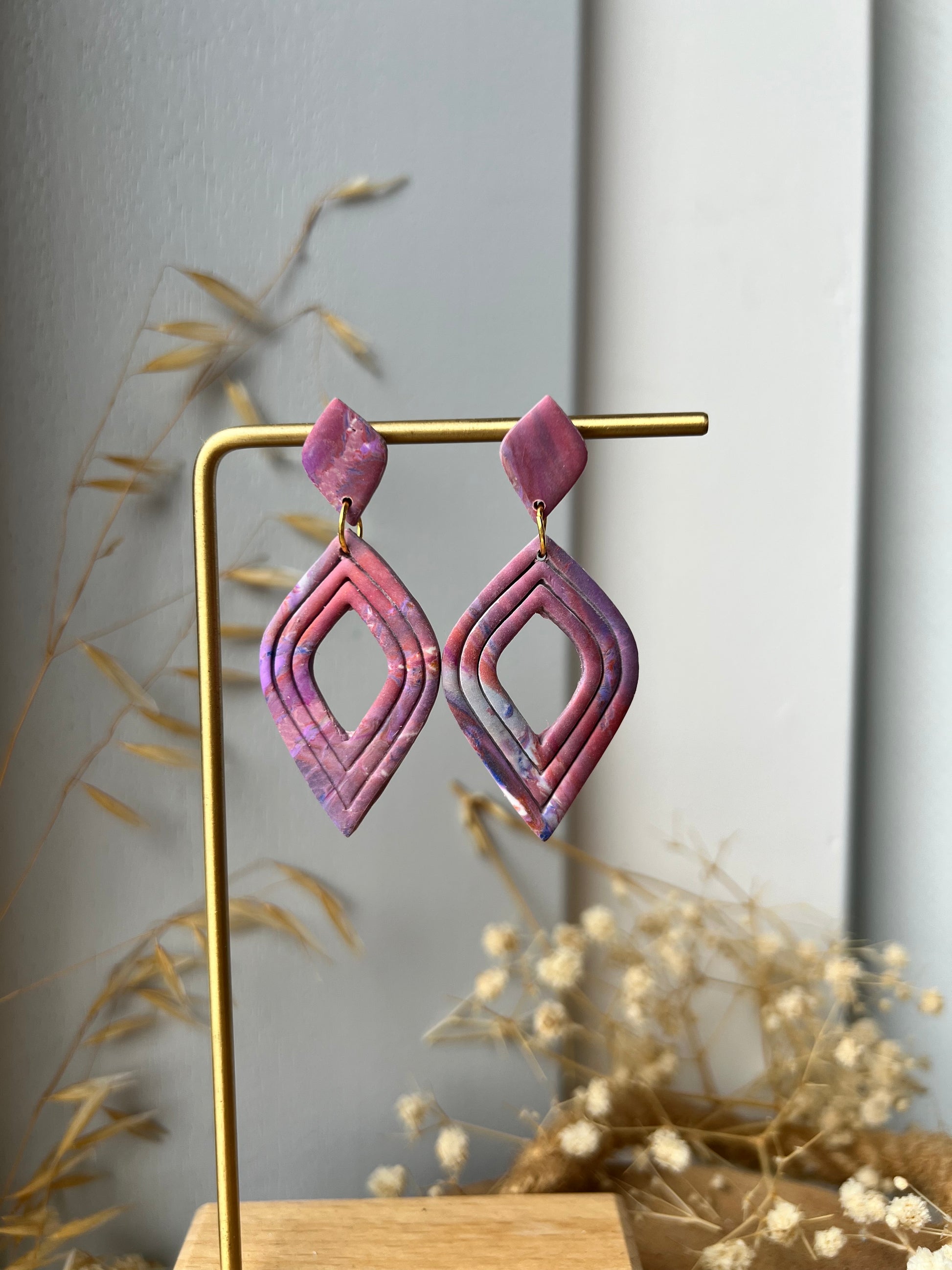 Kleurrijke oorbellen in de vorm van een druppel. In een paarse marmer kleur of een goud gele marmer kleur.