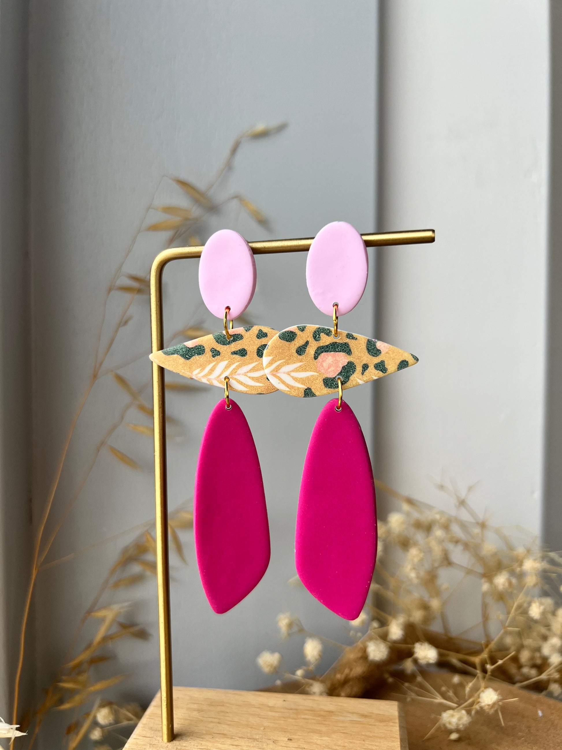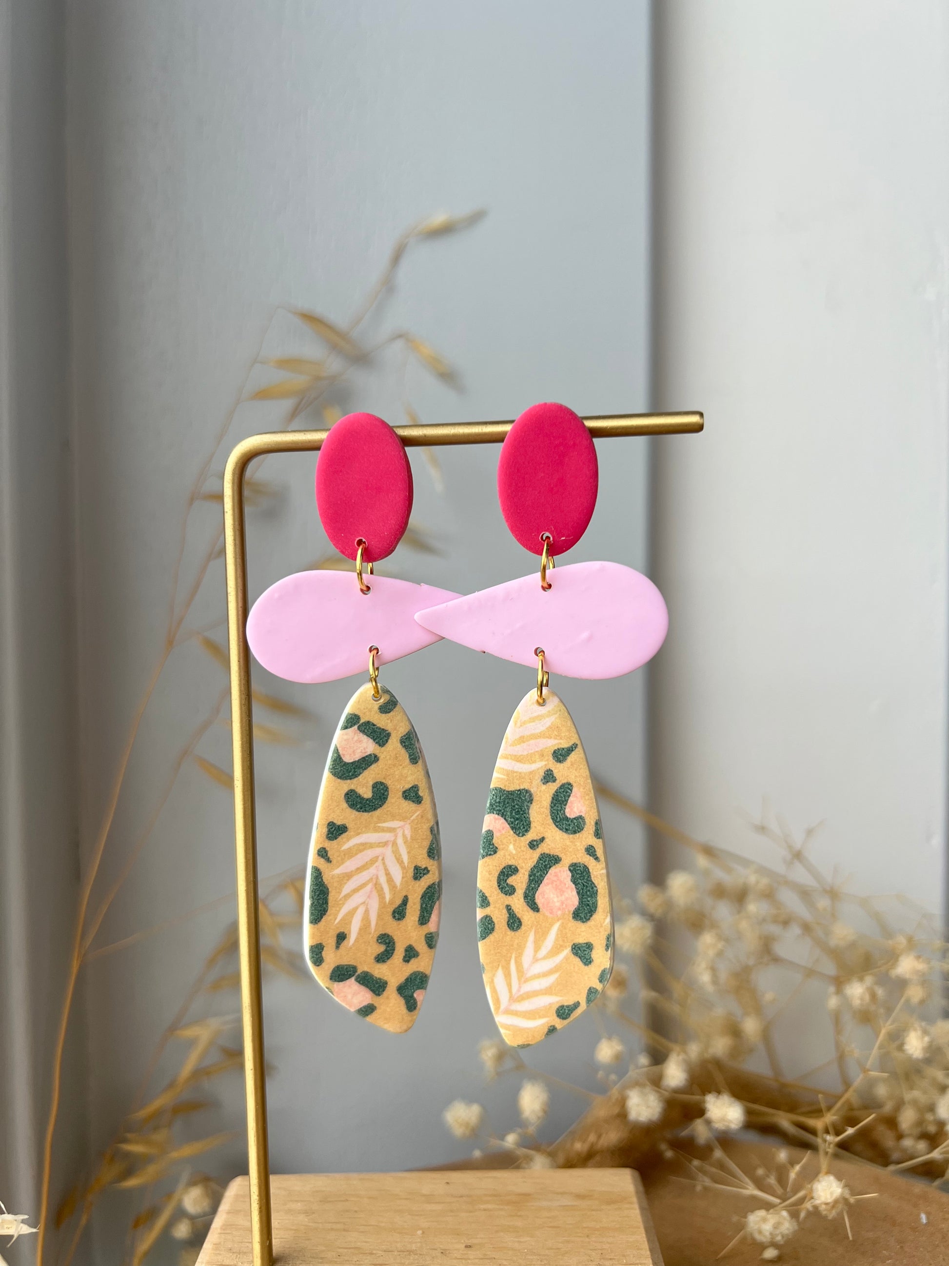 Statement oorbellen met een luipaard print en knallende roze kleuren.