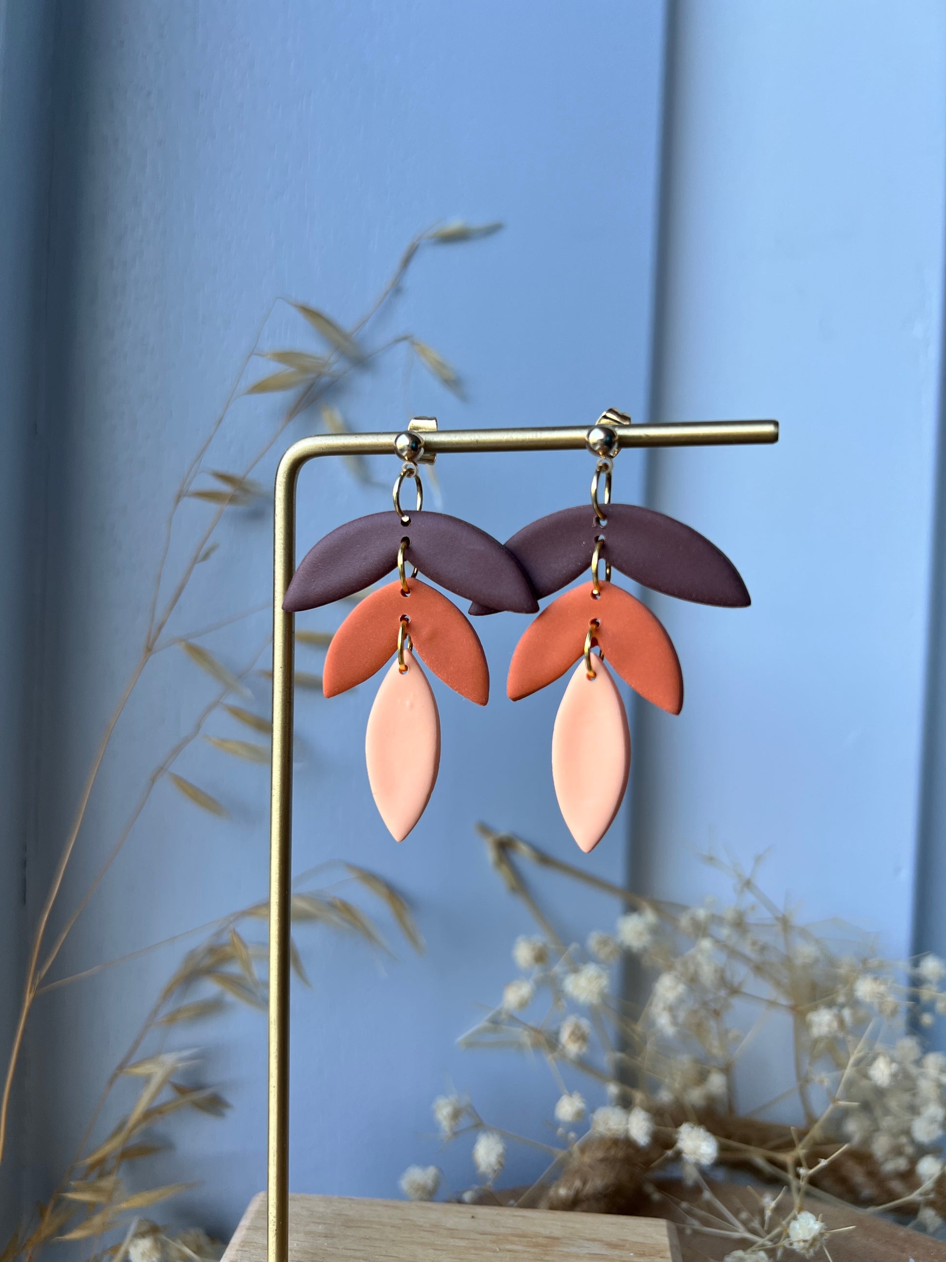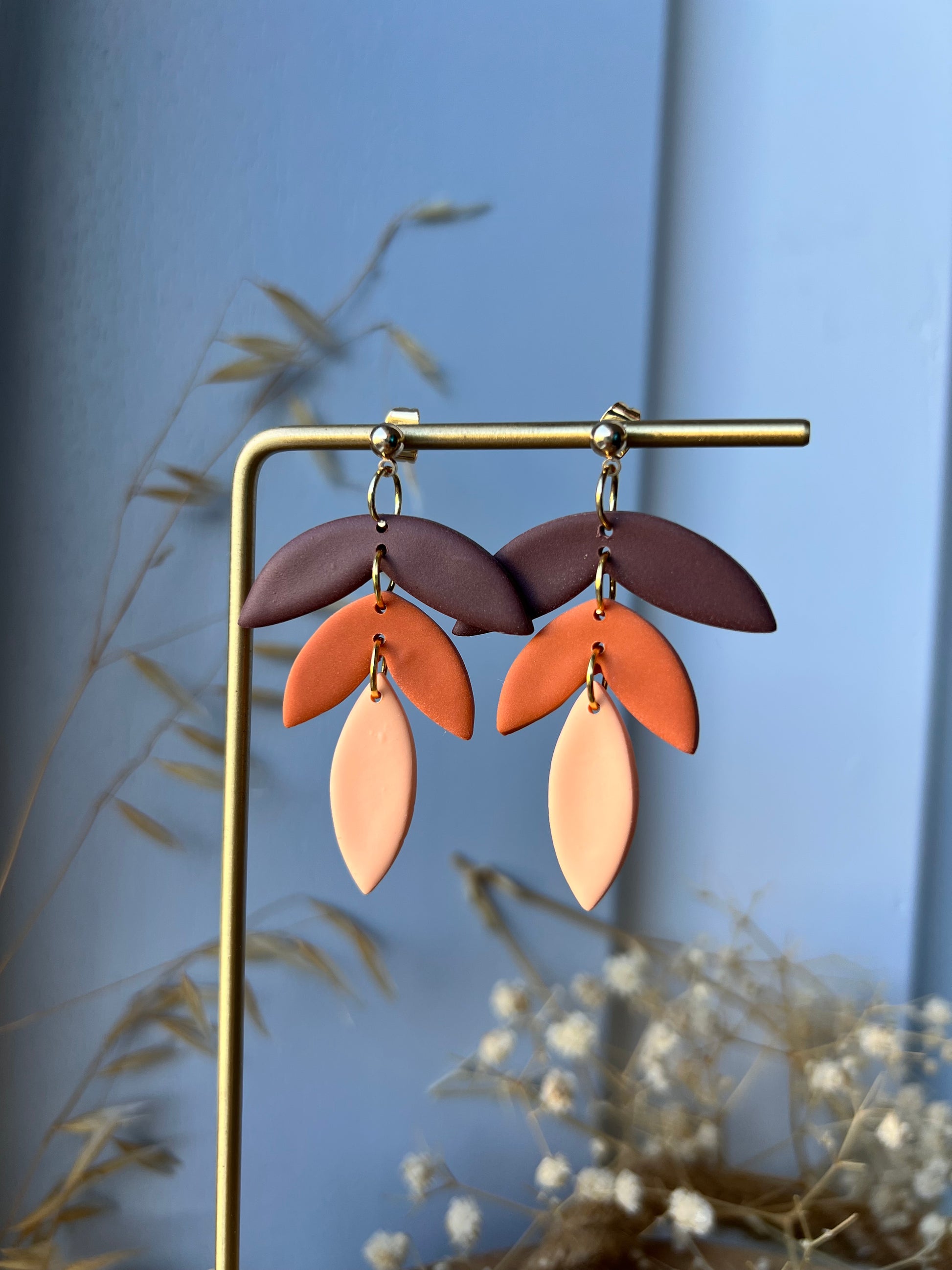 Oorbellen in drie verschillende aarde tinten. Afgewerkt met een goudkleurig knopje.