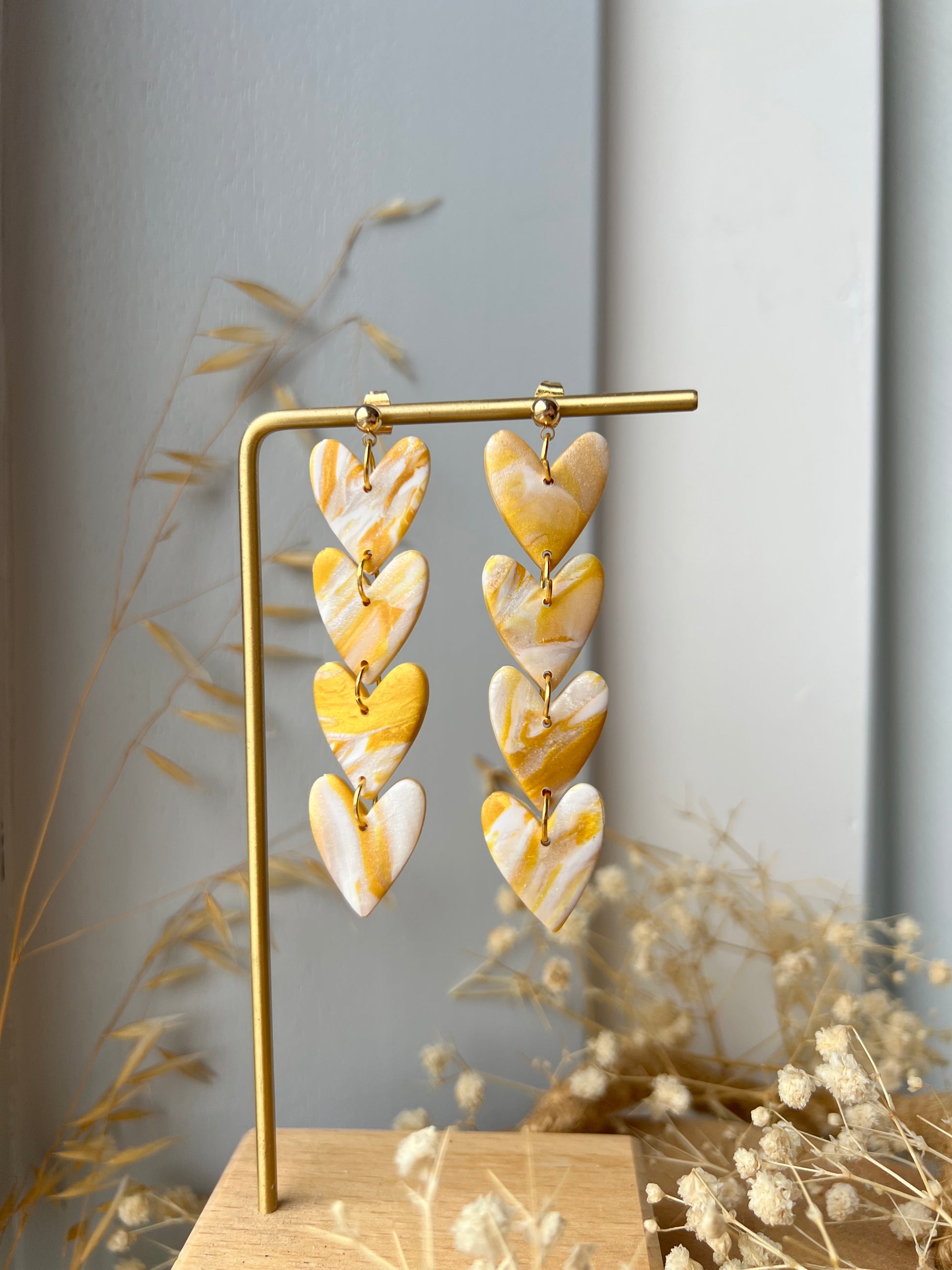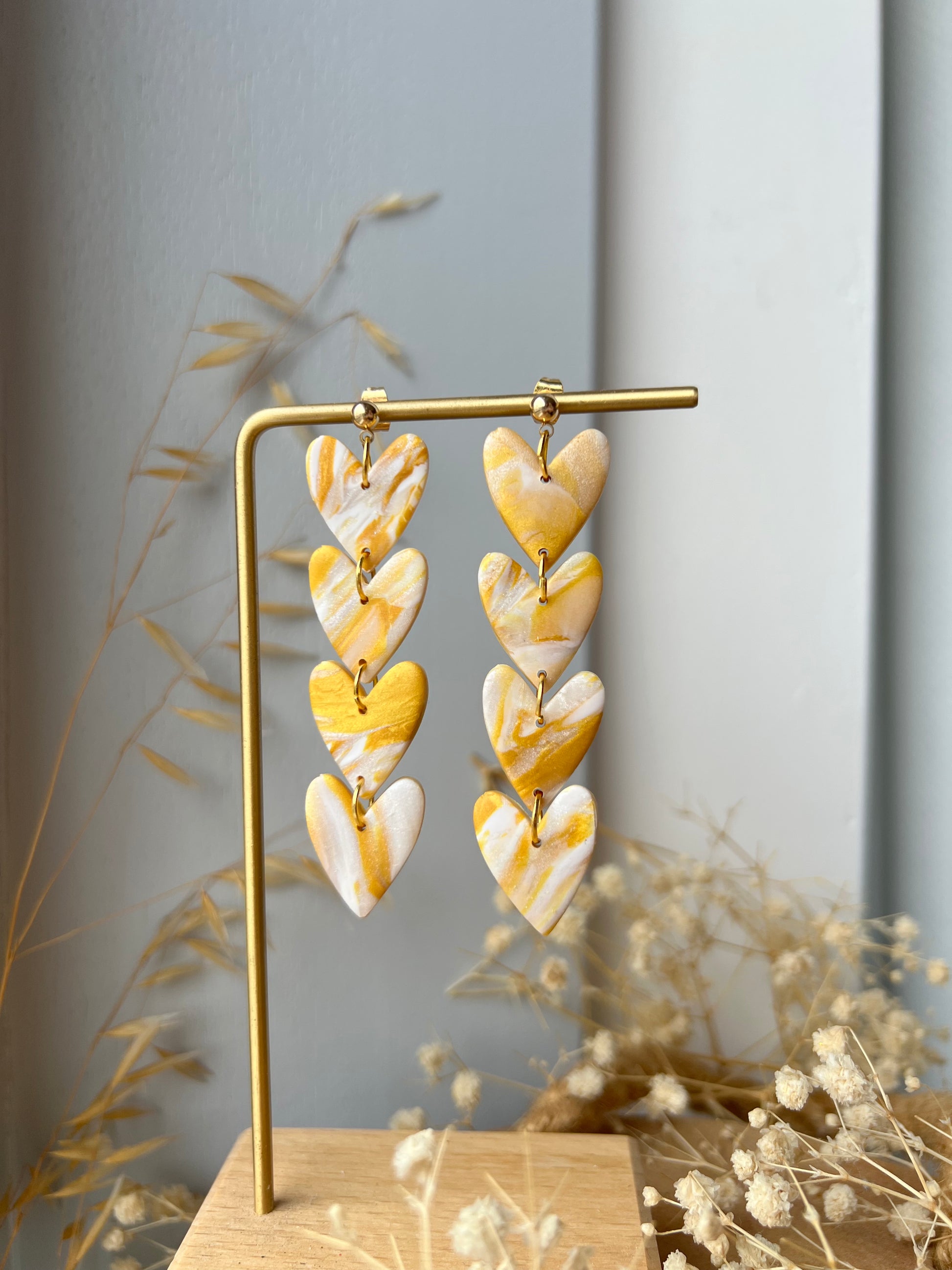 Lange oorbellen met vier hartjes in een geel gouden marmer kleur. Ze hangen aan elkaar met 18k goud vergulde ringetjes. Het stekertje voor in je oor is ook 18k goud verguld.