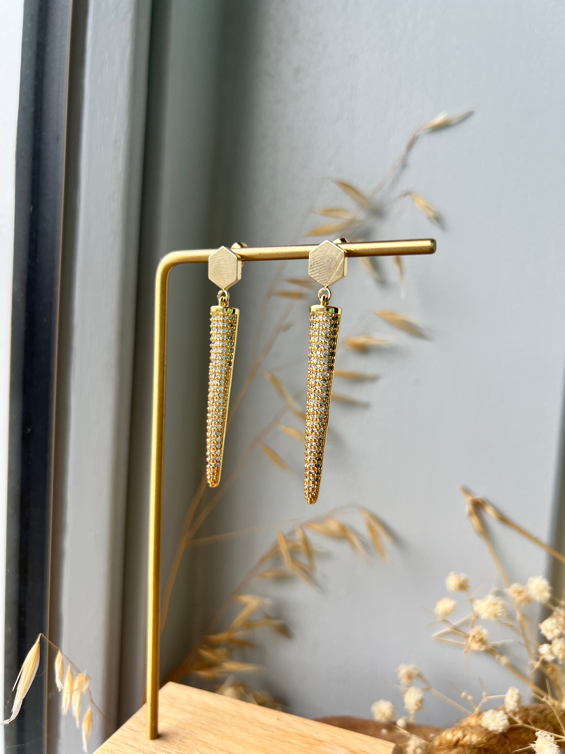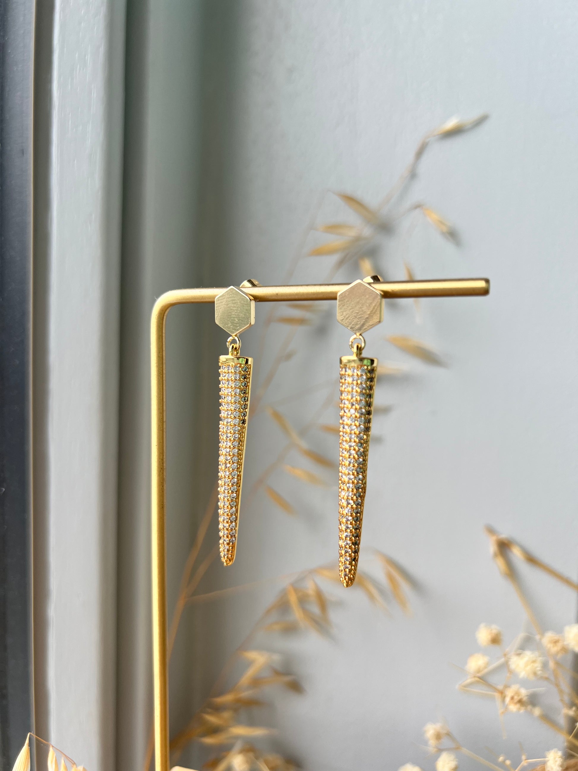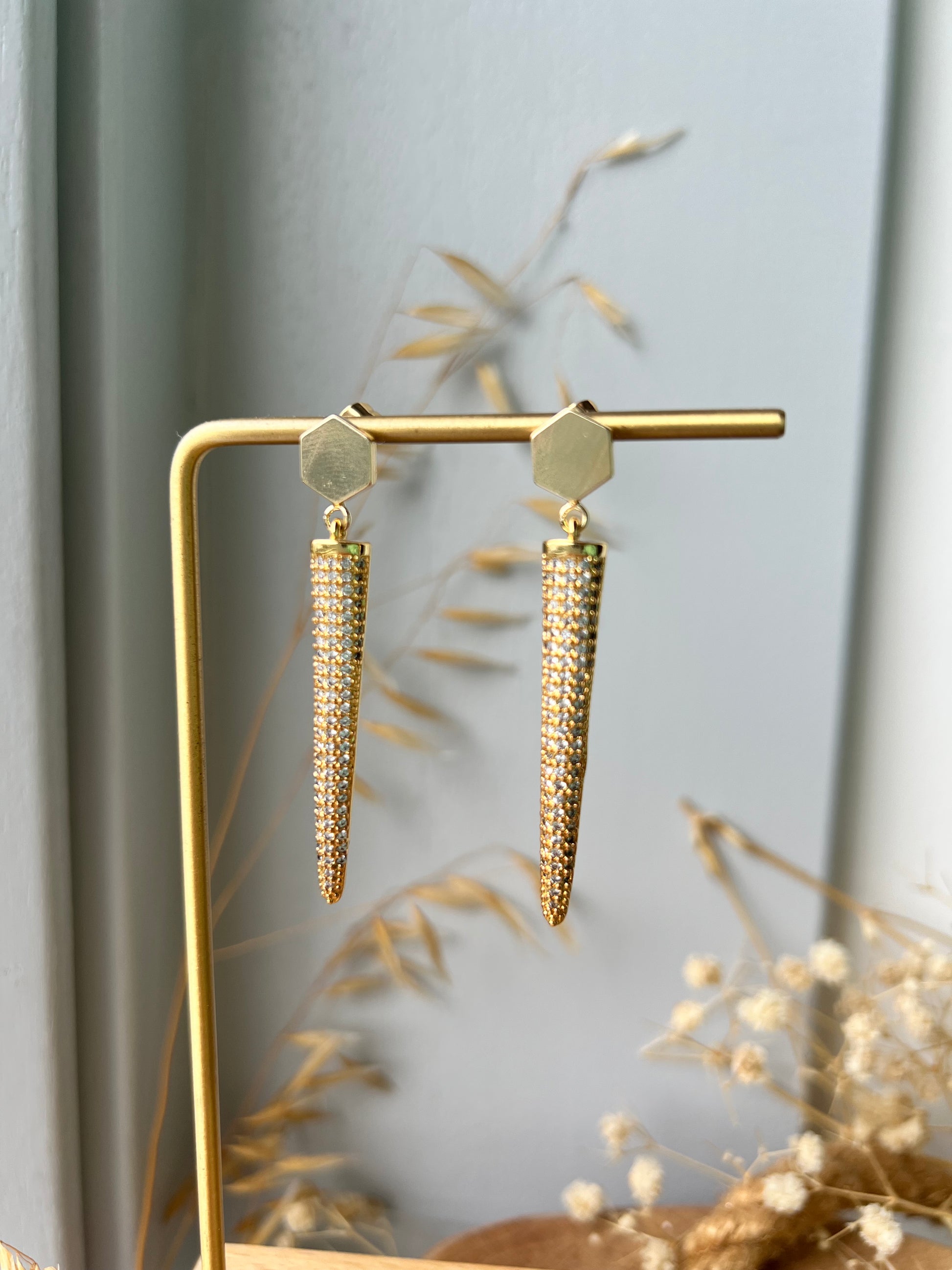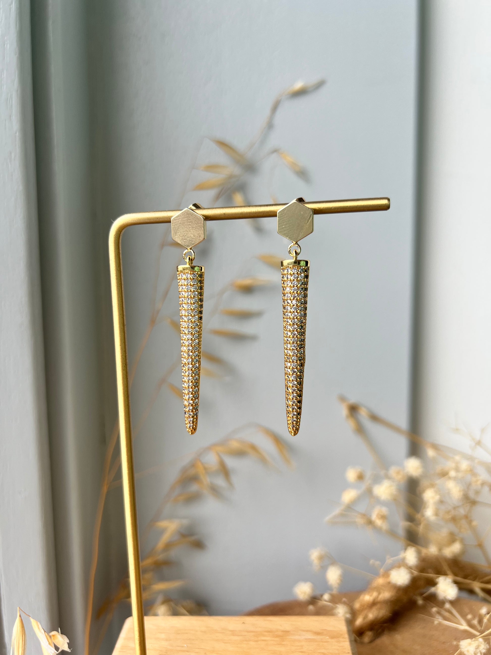Feestelijke 18k goud vergulde oorbellen. Een hexagon knopje en een bedel vol met zirkonia steentjes. Maa je kerst of Nye outfit helemaal af.