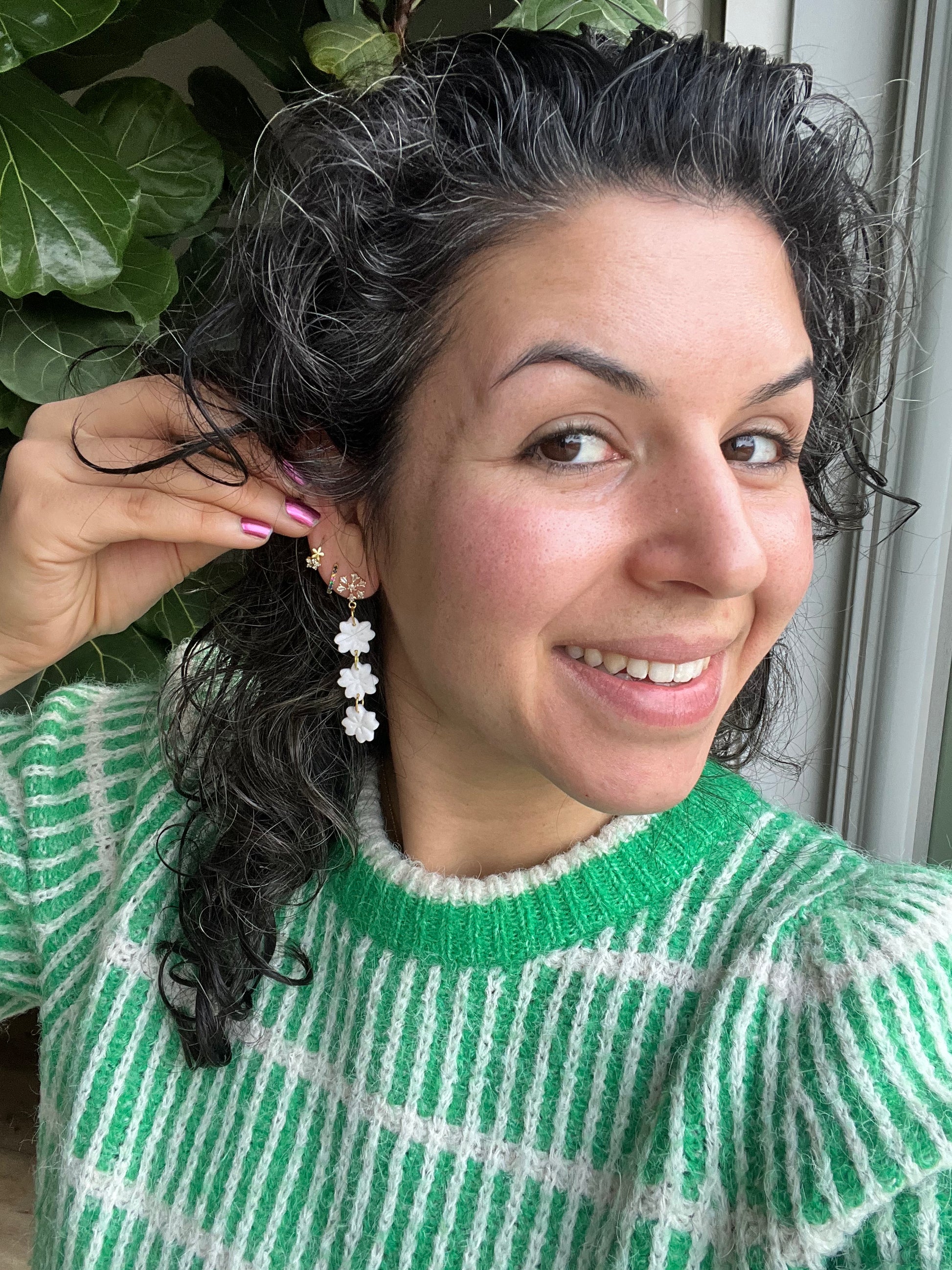 De oorbel bestaat uit een elegante parelmoer sneeuwvlok die subtiel glanst bij elke beweging, bevestigd aan een prachtig 18k gold plated sneeuwvlok-stekertje voor een luxe en feestelijke uitstraling.