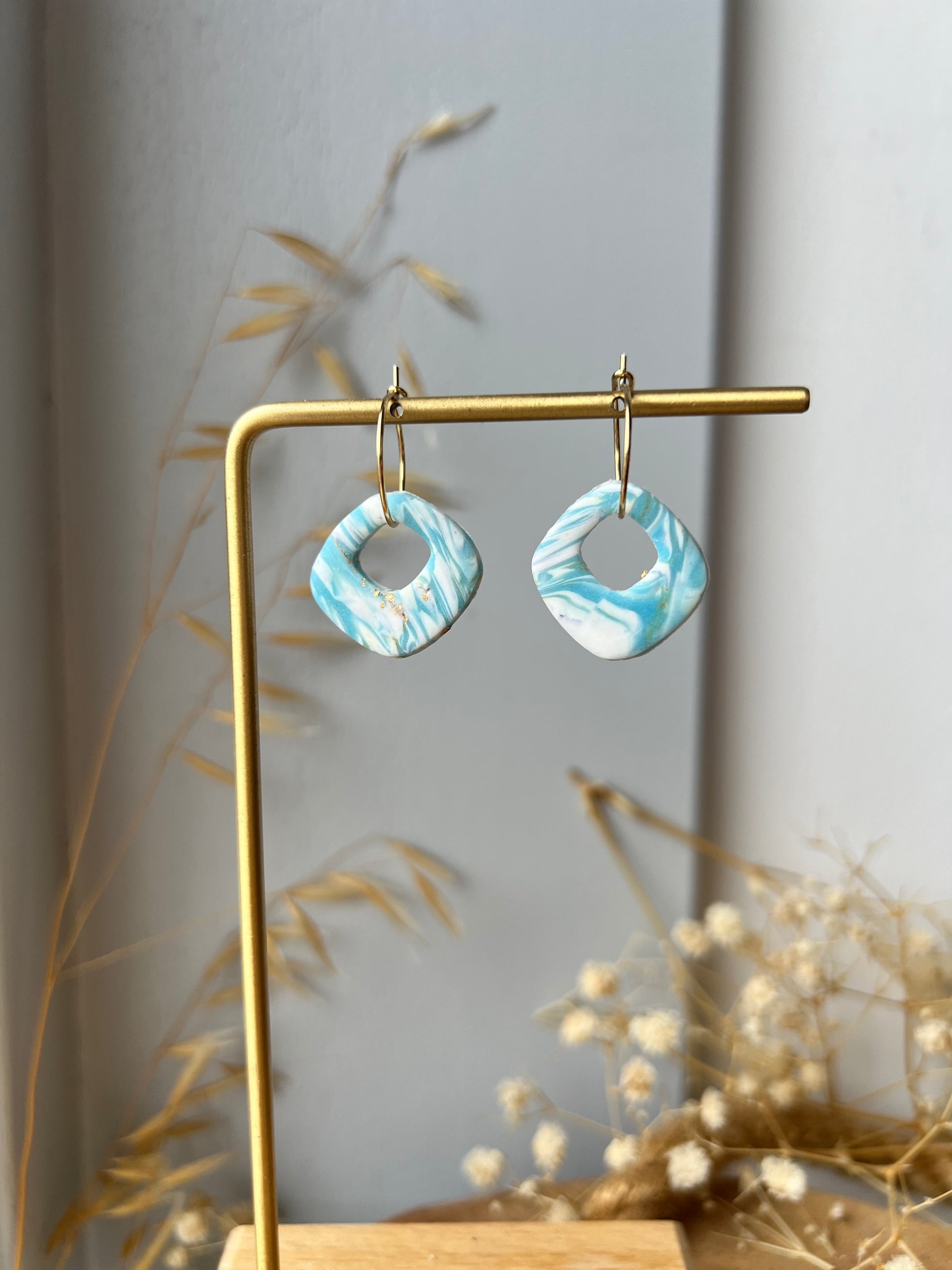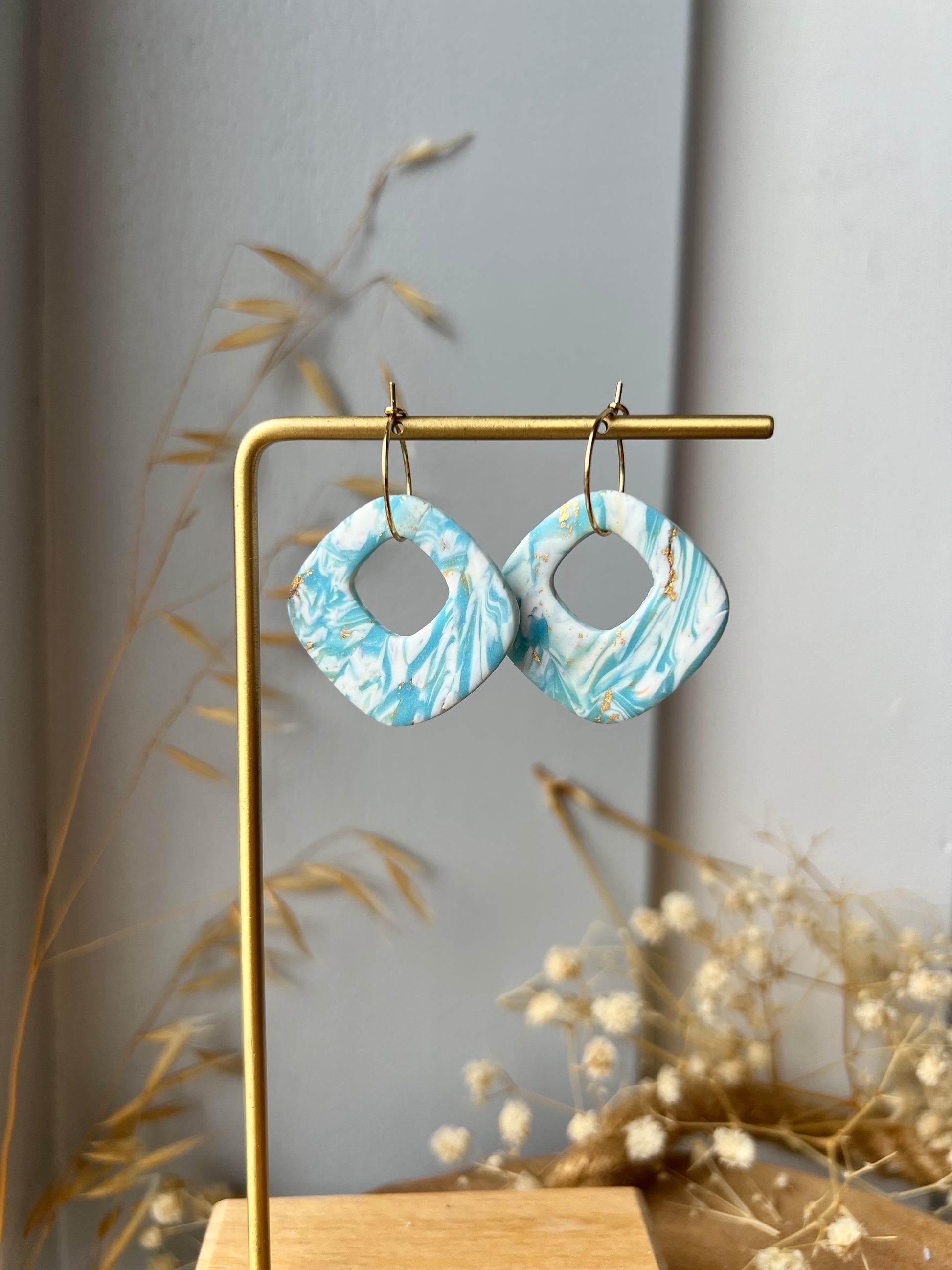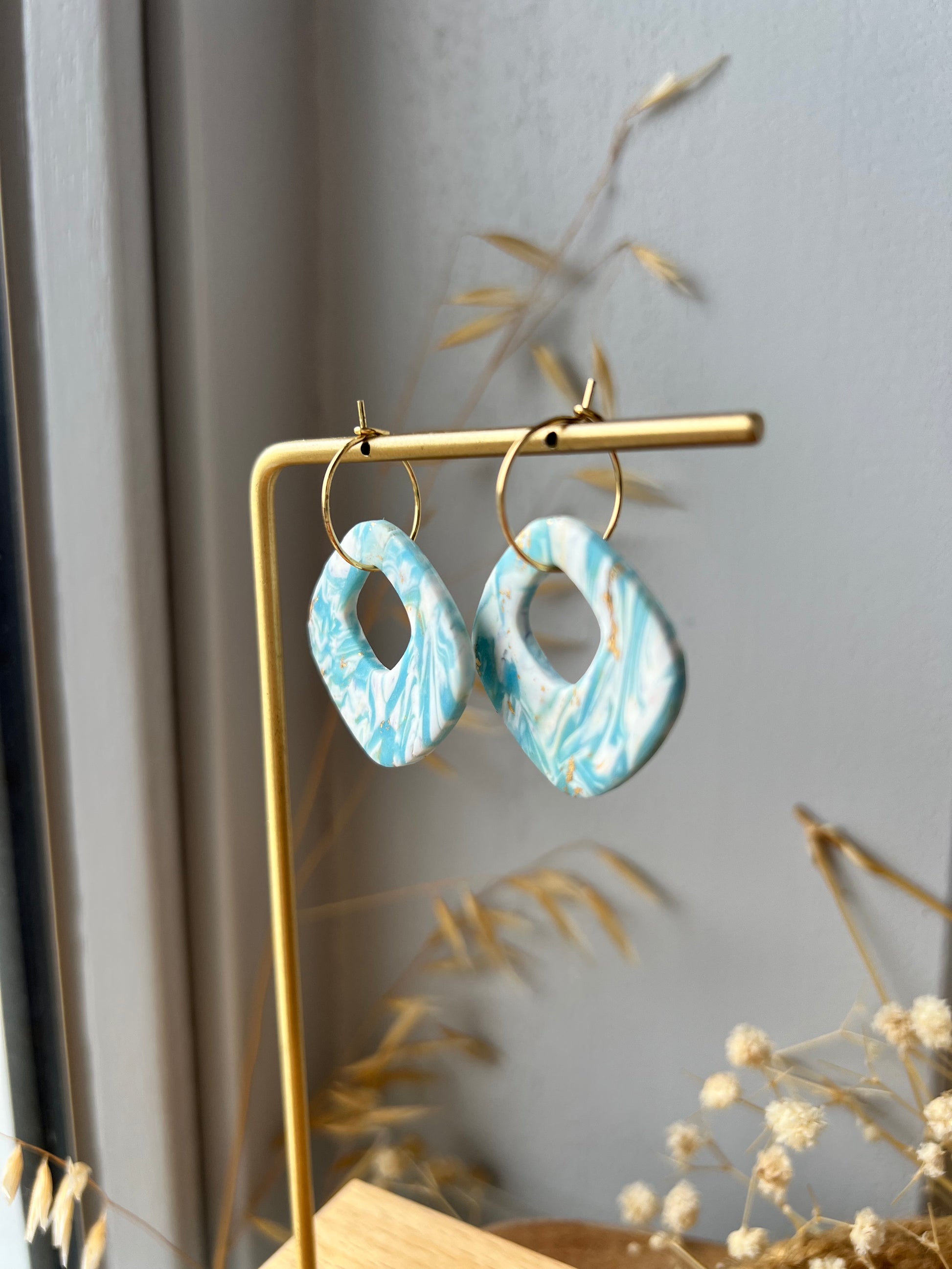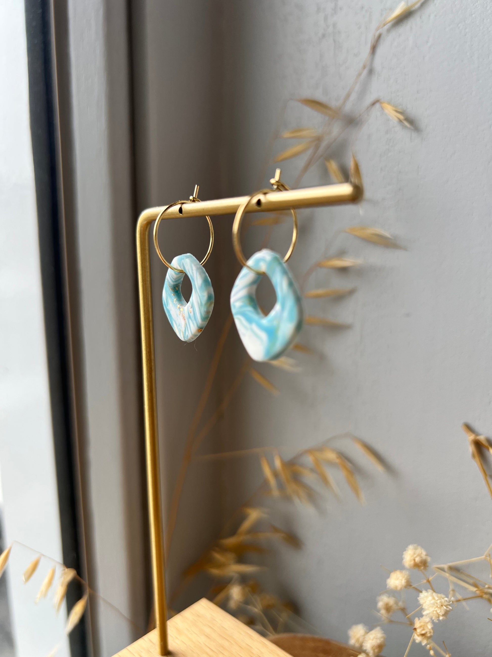 Blauwe gemarmerde oorbellen aan een 18k goud vergulde ring. De blauwe bedeltjes zijn in 2 maten. 3cm of ca 2cm.